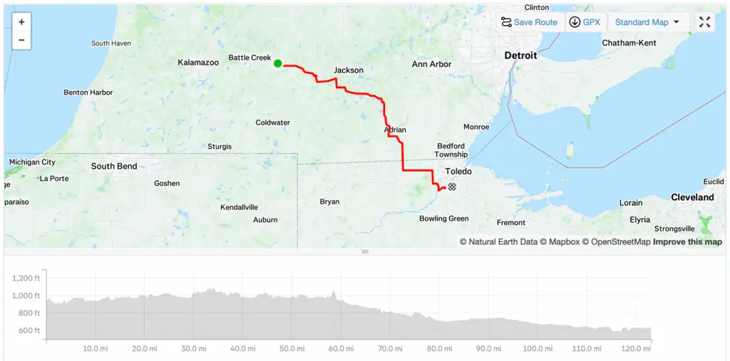 Today was the second longest ride of the trip at 120 miles crossing from Michigan into our tenth state of Ohio. The ride turned into 123 miles with a few construction detours along the way. We had a relatively early start at 7:15 am expecting it to rain most of the day. We were all decked out in our rain gear only to find that it didn’t rain – a welcome surprise! I did keep my rain jacket on most of the day as my upper body hazmat protection from the dirt and grime of the road. As we ride by a fair amount of roadkill, one can only wonder how much ‘just decomposed’ materials we have ridden over along the way. The afternoon brought sunshine and warmer weather with drier roads making the raincoat unnecessary and too warm.