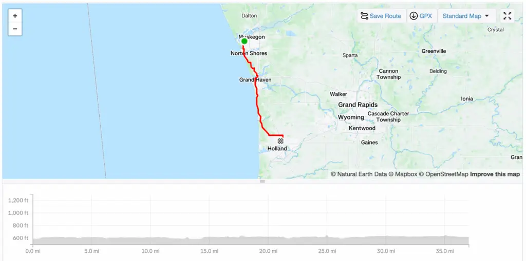 We rode the three miles to the ferry dock. We were loaded with our bikes with impressive ease and organization. There were a number of wall mounted bike holders around the outside of the level where the cars ride. We placed our bikes on these wall mounts and used the ferry provided ratchet straps to keep them intact in the even of inclement weather or rough waters. Once tied down, we made our way up to the passenger level and found our seats for the ride. I went up to the sundeck level at the top of the feerry for our departure from the port to enjoy the views of the Milwaukee skyline. As we left the protection of the barriers, I went down to my seat and pulled out my laptop with the intention of writing. I was feeling a bit drowsy and thought I’d close my eyes for a few minutes since we had at least two hours on the ferry. I nodded off and managed to sleep for just over an hour and a half. Being able to sleep anywhere is both a blessing and a curse. I had already eaten my bag lunch before we left and was feeling a bit hungry. i could wait, howver, until we were off the ferry and getting ready for our short ride from the port to Holland, Michigan. We were unloaded from the ferry with the same order and ease with which we were loaded and were off very quickly after docking.
